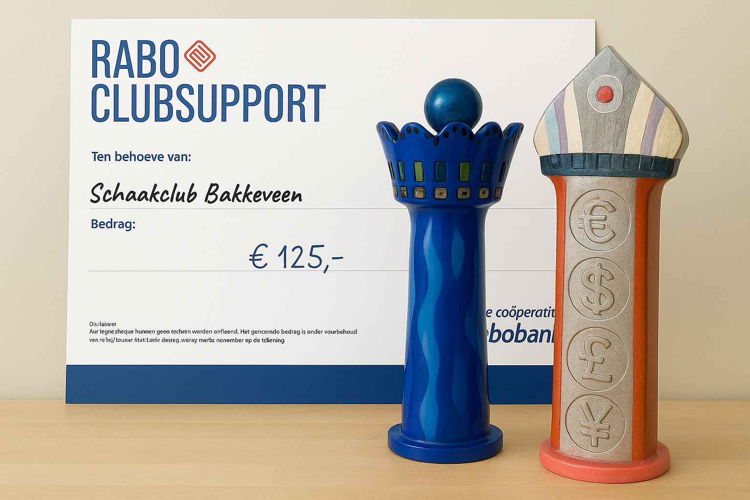 Allereerst een woord van dank aan alle mensen die hebben gestemd op Schaakclub Bakkeveen voor de RABO CLUBSUPPORT actie van de RaboBank. Dit mooie bedrag zal worden ingezet om de schaakclub nog meer publiciteit te geven en ter ondersteuning van de viering van het 25-jarig jubileum van de club in 2026!