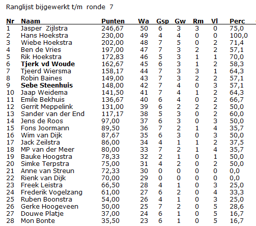 De interne competitie is inmiddels alweer 7 rondes oud en wordt nipt aangevoerd door Jasper Zijlstra. Maar er liggen veel belagers op de loer waaronder Hans Hoekstra die met 4 uit 4 een 100% score heeft maar wel een aantal wedstrijden heeft moeten missen. Tjerk van der Woude staat het hoogst genoteerd in de tweede rating groep, en Sebe Steenhuis in de derde rating groep.